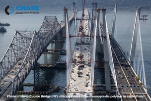 Chase Construction Product’s asphalt additives (Rosphalt® R50 and Rosphalt® LT) create a 1-step waterproofing and wear protection course for bridges, roadways, tunnels, parking decks, ports, terminals and other high traffic loading areas. The dry powder additive is combined in an asphalt plant with heated aggregate and liquid asphalt. The result is a highly modified mixture that exhibits elastomeric properties based on the thermoplastic nature of the polymer additive. Chase also offers a solvent based tack coat and sealer material as accessory products to complete the waterproofing solution.